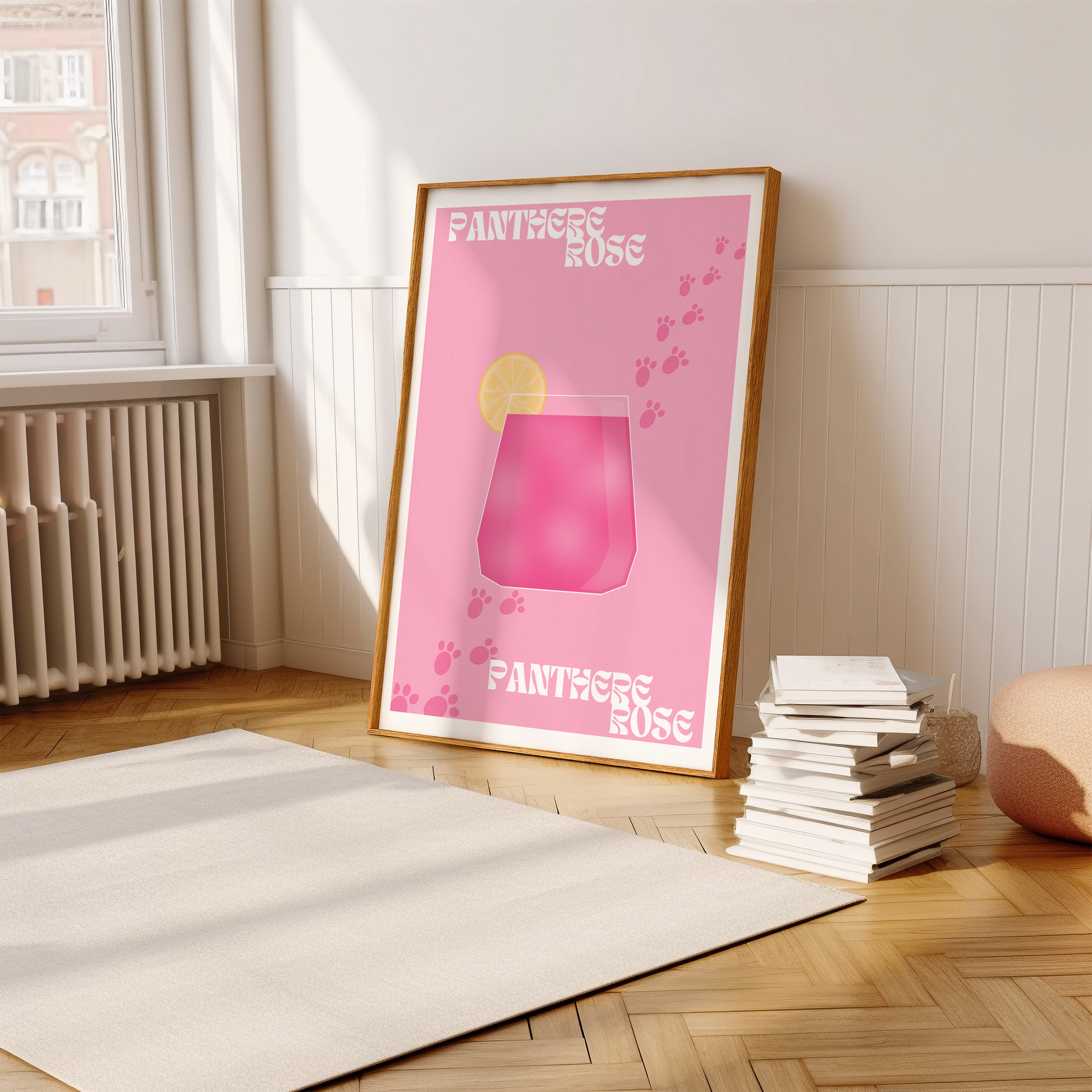 Plongez dans l'univers de notre affiche du cocktail Panthère Rose reprenant l'essence pétillante et raffinée de ce cocktail emblématique. Les tons roses et les détails subtils évoquent l'esprit élégant et mystérieux de la Panthère Rose.