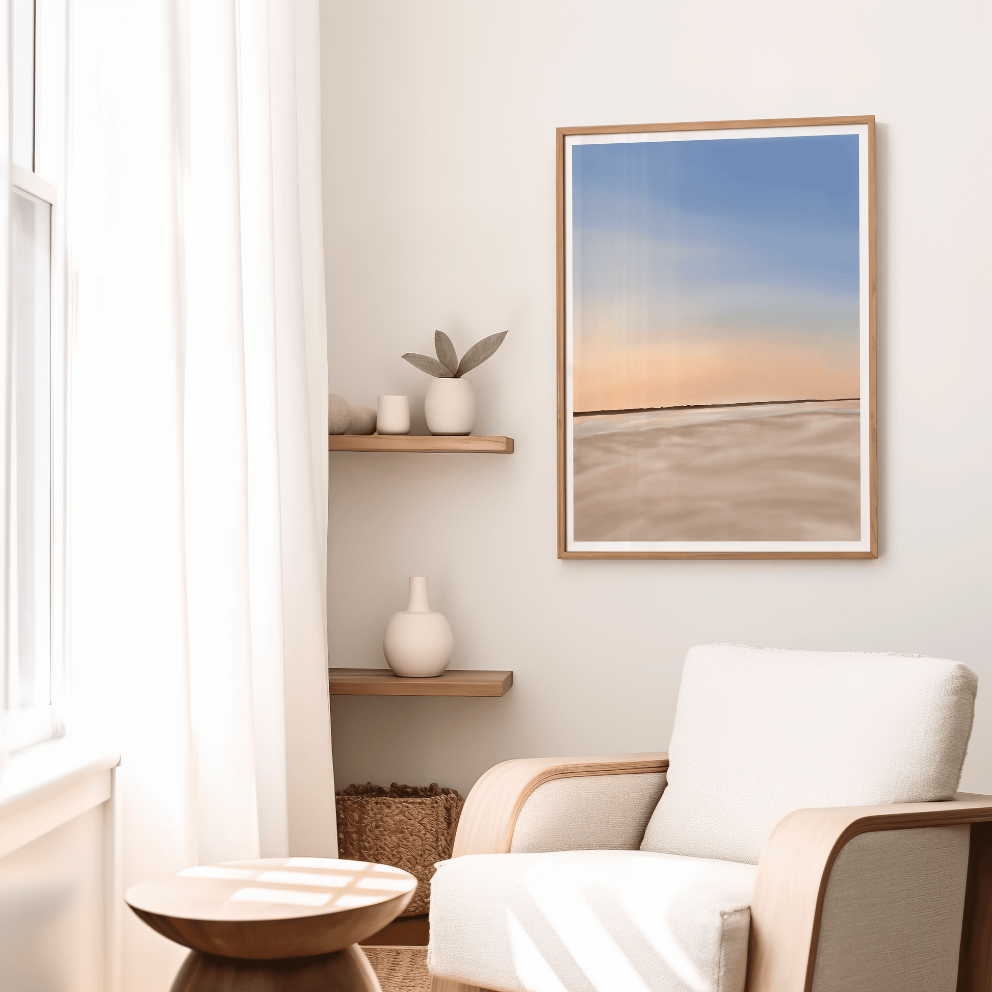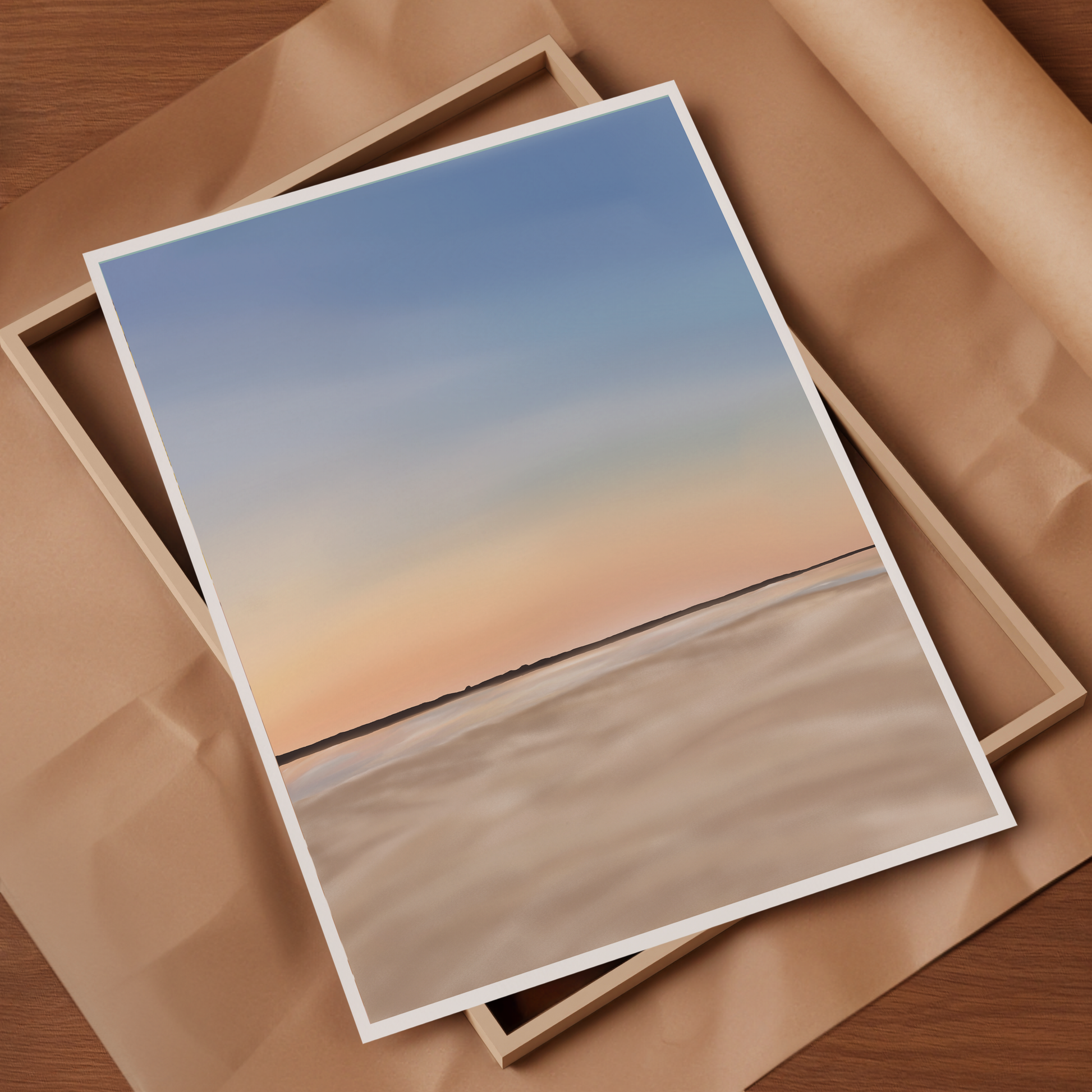Cette illustration capture la tranquillité de l'océan, des nuances changeantes du ciel, évoquant la sérénité.